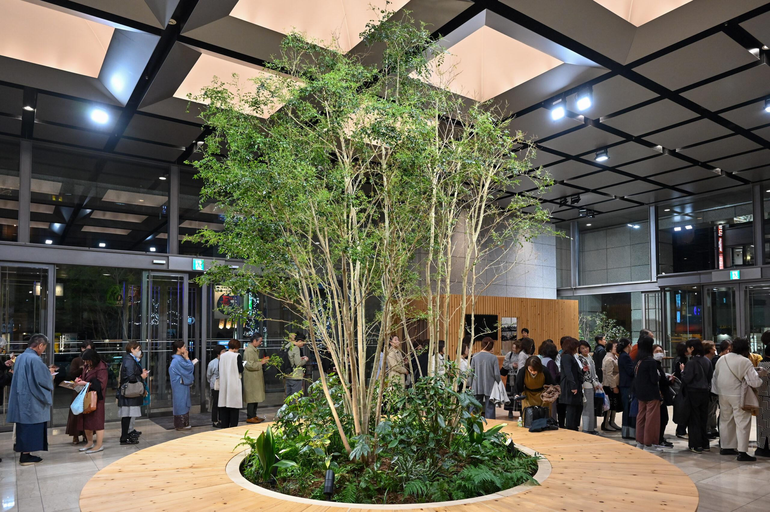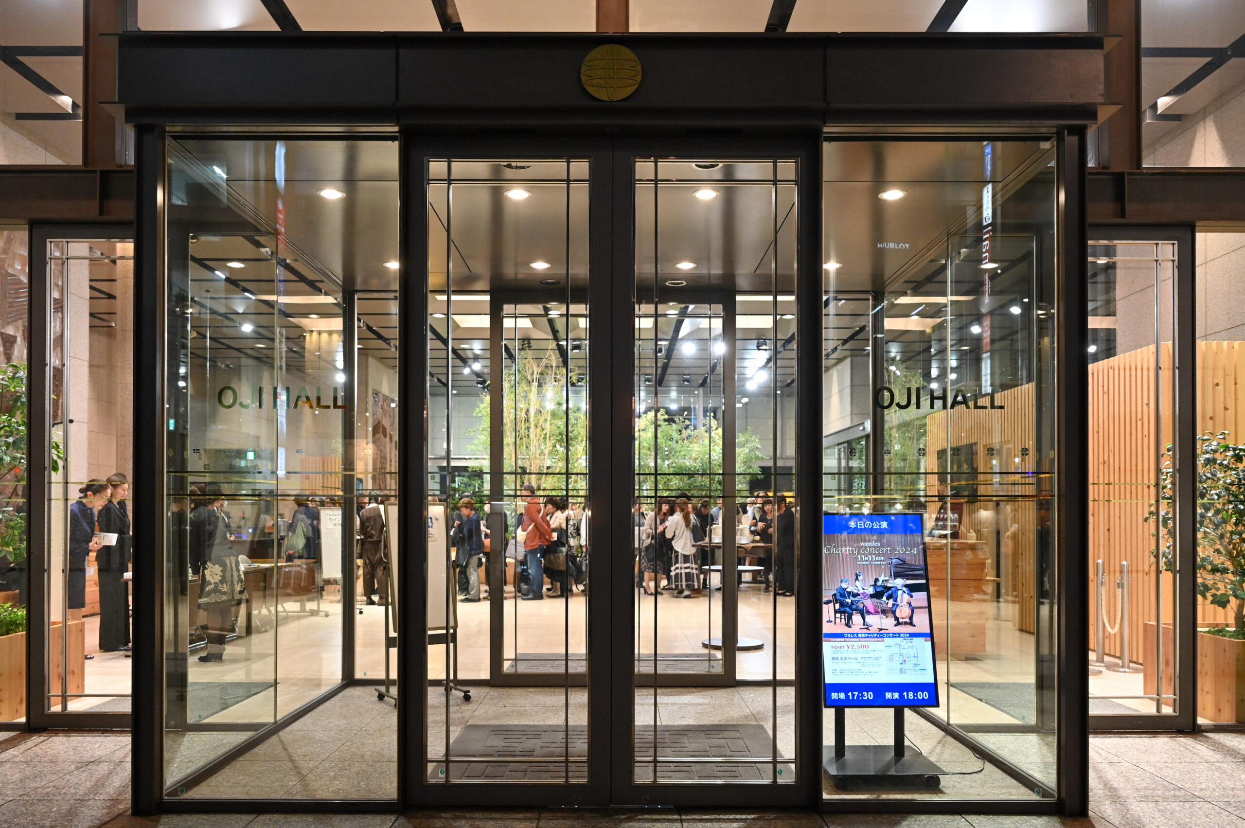 王子ホールエントランスの、木の温かみと緑豊かな開放的な癒しの空間で来場者の皆様をお出迎え。