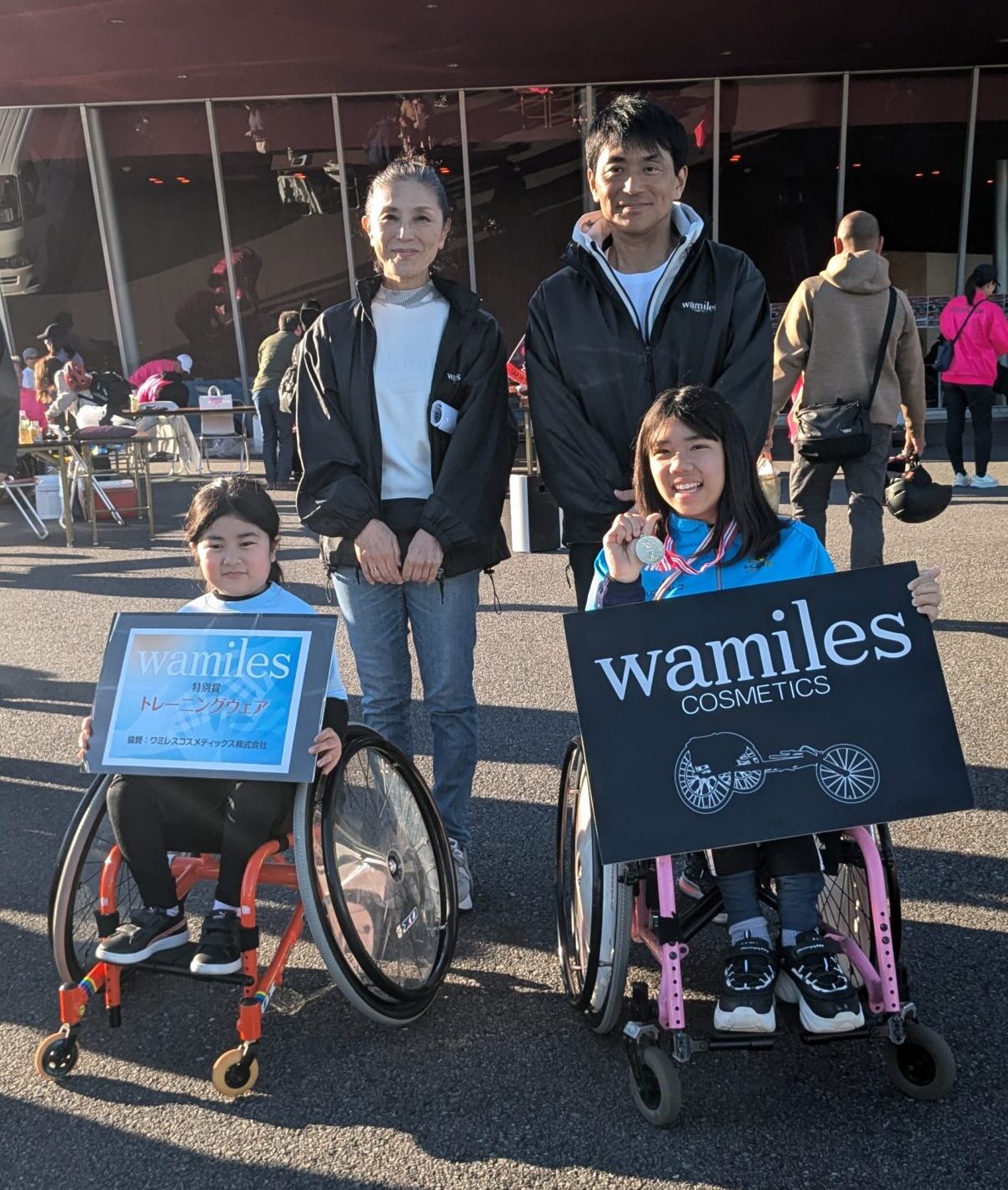表彰式では、5km女子ユースの部で1位に輝いた佐々木琴音さん(右)へワミレス賞(オーダーレース用車椅子)を、